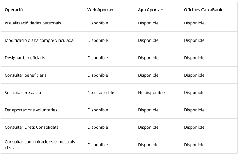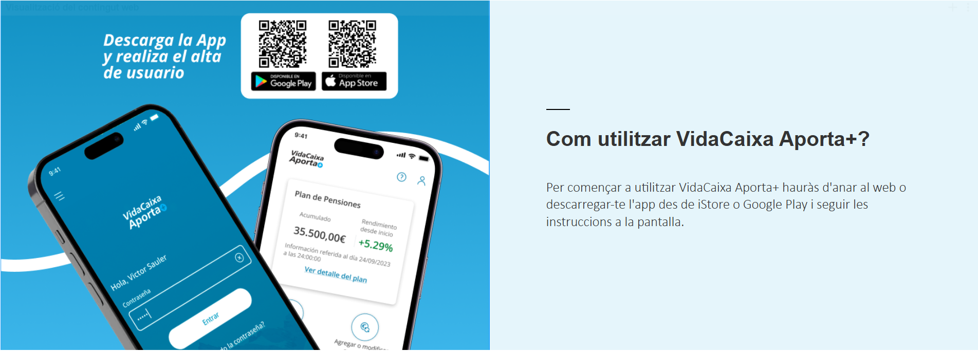 VidaCaixa Aporta+ és una plataforma digital gratuita disponible per a partícips en format web i app. Dins de VidaCaixa Aporta+, podràs consultar i gestionar els teus plans de pensions i documentació rellevant. També podràs gestionar operatives tals com aportacions voluntàries (addicionals a les aportacions del promotor), gestionar els teus beneficiaris, consultar rendibilitats del pla i més.